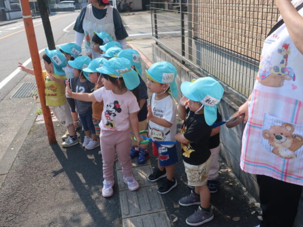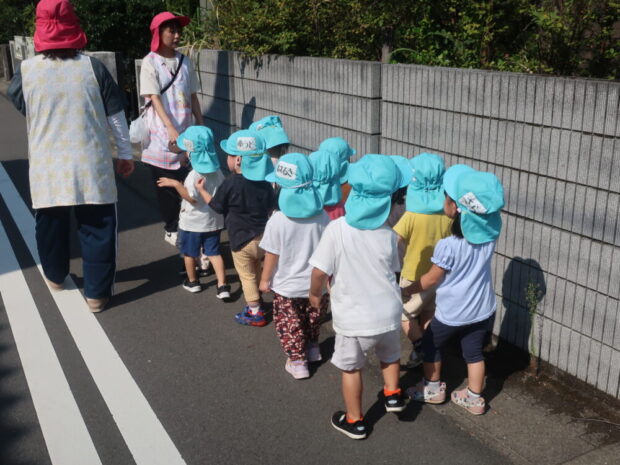 園を出発する前にお散歩リングを離さないことを先生たちとお約束しました。みんなお約束を守って上手にお散歩しました。