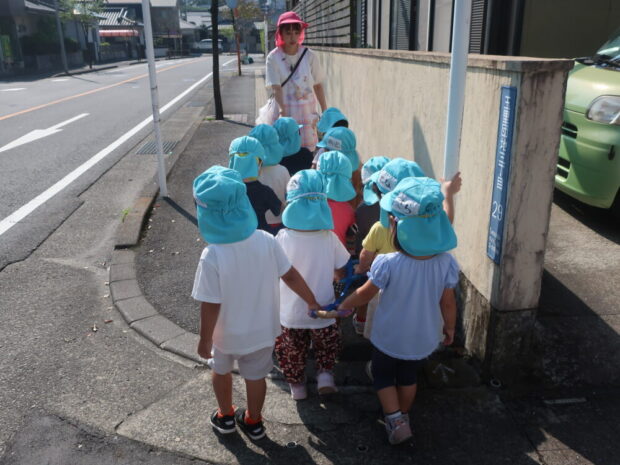 園を出発する前にお散歩リングを離さないことを先生たちとお約束しました。みんなお約束を守って上手にお散歩しました。